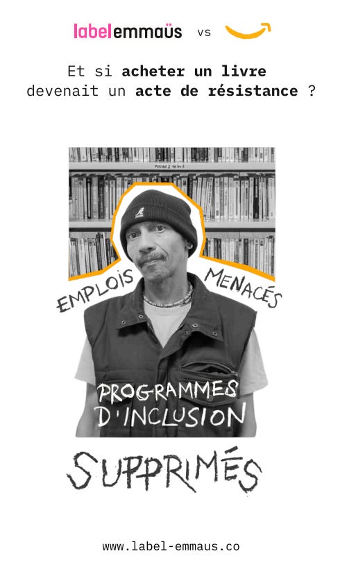 1. Et si acheter un livre devenait un acte de résistance ? Label Emmaüs s’engage contre les géants du e-commerce. Pour la Journée mondiale du livre, Label Emmaüs a lancé la campagne « Et si acheter un livre devenait un acte de résistance ? » Pour trouver votre prochain livre (et soutenir un modèle coopératif et engagé), RDV sur www.label-emmaus.co